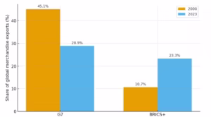 As shown in Figure 2, the share of global merchandise exports of the G7 countries fell from 45.1% in 2000 to 28.9% in 2023. For their part, the Brics+ share rose from 10.7% (2000) to 23.3% (2023).